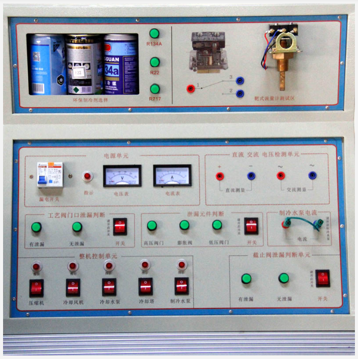 LG-TZL02制冷與空調運行操作實訓設備根據《制冷與空調設備運行操作作業安全技術實際操作考試標準》研發。采用蒸汽壓縮式制冷循環系統,配備全封閉式制冷壓縮機、冷凝器、蒸發器等制冷系統真實部件,并設有智能溫度調節儀、流量計、壓力表、電壓表、電流表等測量儀表。考核以實際操作、仿真模擬操作完成。
