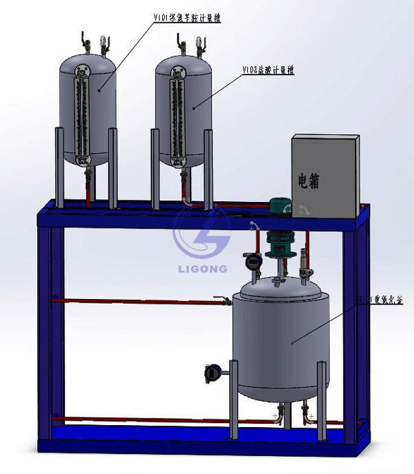 整套裝置由鋼制安裝框架、苯胺計量槽、亞硝酸鈉計量槽、冷凝器、重氮釜、仿真儀表、就地計算機操作臺、、就地智能儀表控制上位監控軟件、外置配套設備等組成,工藝路線簡潔清晰,現場儀表與通訊模塊有機結合,上位計算機控制,設置DCS界面及自動評分系統。