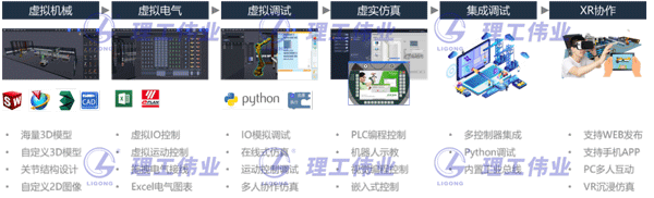 IMT數字孿生系統能夠從虛擬機械設計、虛擬電氣接線再到虛實互動編程,虛擬調試以及集成調試的整個過程,同時配置XR互動仿真,能夠實現多人協作的沉浸式應用,IMT系統具有多種仿真和組合方式,支持半實物、全虛擬、以及3D互動的編程方式。