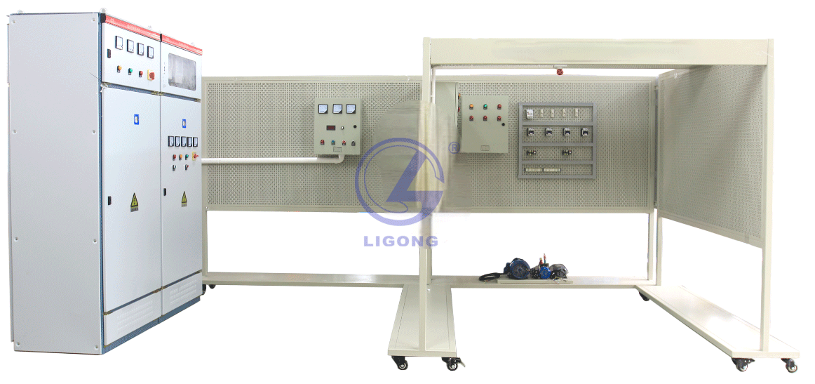 (7) 電動機機組、變壓器:配有電動機安裝平臺一套、350W直流電機一臺、1.1kW三相鼠籠式異步電動機一臺、5kVA干式變壓器一臺帶無載分接頭,分別可以正負5%和10%無載調壓。