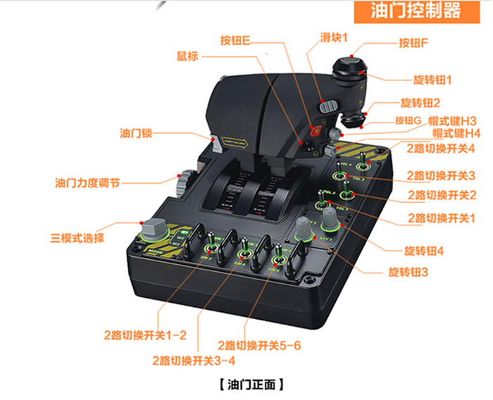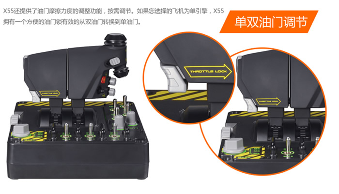 民航:塞斯納YOKE搖桿、腳跺、飛行儀表裝置等 戰斗機:套賽鈦客X-55(左手油門桿、搖桿) |
