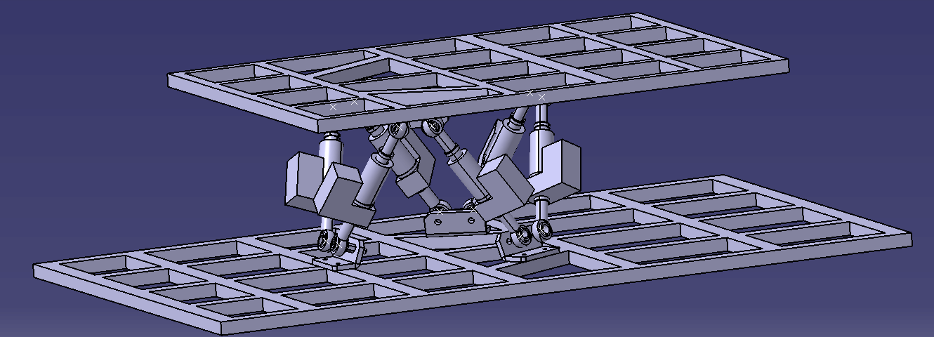 6自由度伺服電機控制電缸動感平臺,可實現前后、左右、上下三個方向的動態運動。伺服電動缸行程:200mm,前后傾角30º,左右傾角30º,水平轉角30º。承重:1000KG;總重250KG。采用高速六自由度反解算法,快速響應飛機的動態,達到與畫面完全同步的動態效果。