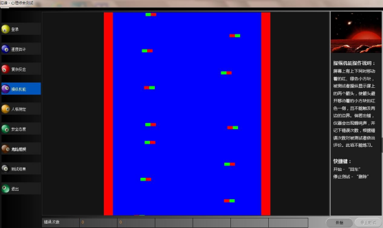 檢查方法: 在距被試 0.5 米處的屏上會定時、有序或隨機出現黃、綠、紅三色圓形光標,這三種色彩分別對應左手、右手和右腳反應鍵。當相應色標顯示時手或腳應通過工作臺上、臺下的按鍵在 2 秒鐘內作出相應的按鍵反應(倘若出現色標的同時有蜂鳴聲出現則不應作出反應),L對應左手,R對應右手,工作臺下還有一個腳鍵。反應時間以 1/1000 秒為單位,用數字表示。被試練習四次后再測試 16 次,根據其平均反應時間和錯誤次數評分。顯示結果中“-9” 為無蜂鳴反應錯,“-8”為伴蜂鳴反應錯,“-7”為伴蜂鳴反應正確(不反應)。