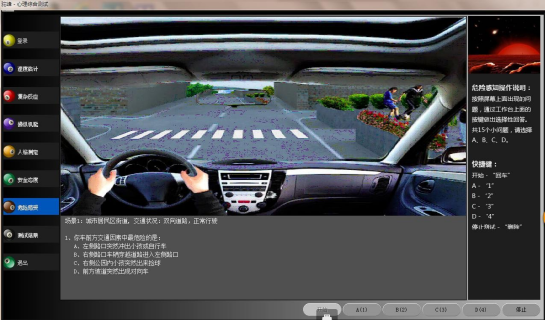 主要能實現速度估計測試、復雜反應判斷測試、操作技能測試、危險感知測試、駕駛員人格測試、駕駛員安全態度測試、注意力分配與轉移測試、深度知覺測試等內容。