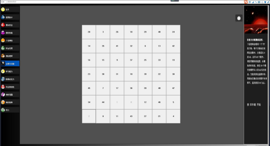(1)本項測試的主要功能是測試駕駛人在一段時間內,有目的地把注意力分配到不同任務,以及在新任務到來時,迅速把注意力從一種活動轉移到另一種活動的心理素質和能力,測試采用美國約瑟夫布洛克注意力分配與轉移測試量表,49個方格,方格的排列順序:7×7方格,數字組成:0、1、2、3……48,共49個數字。