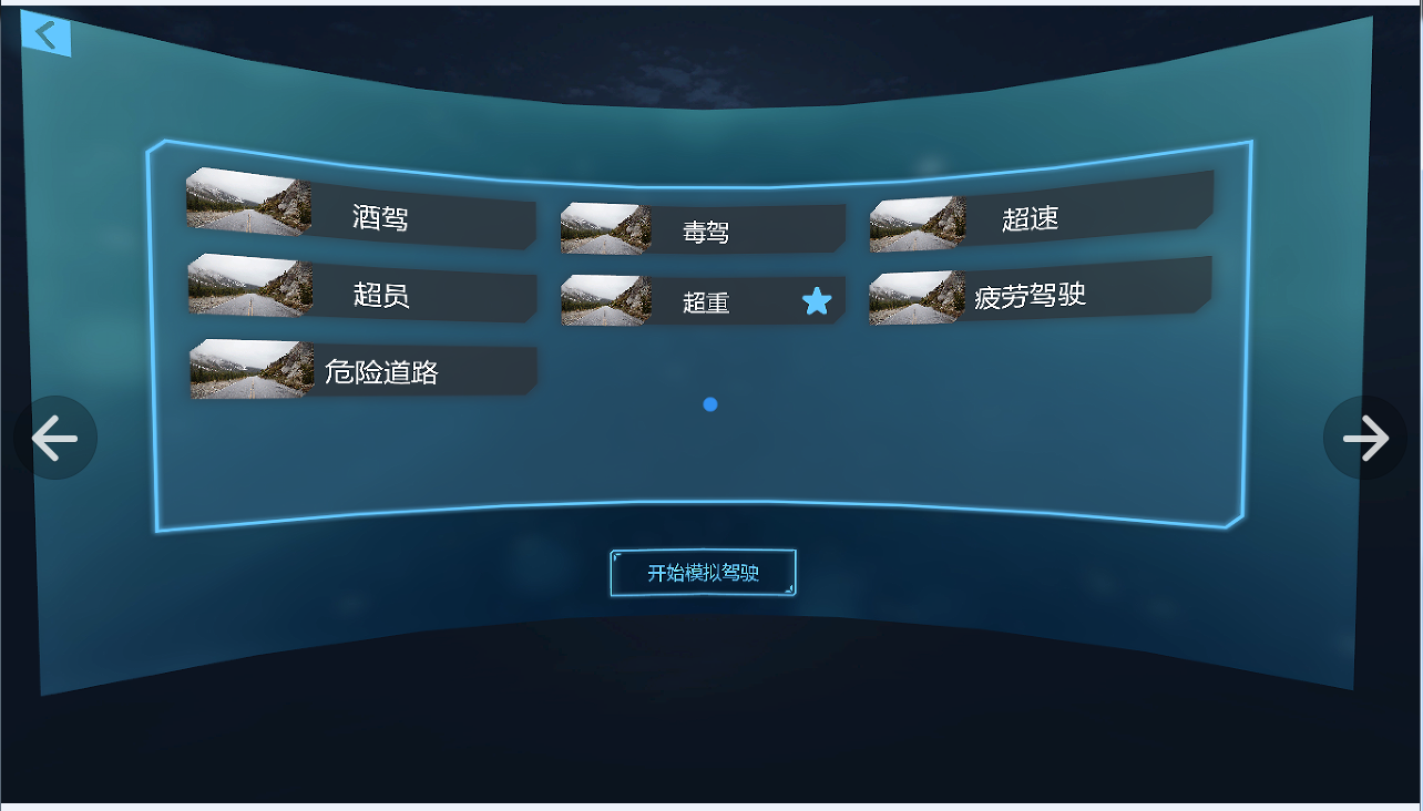 (1)VR動畫交互:酒駕模擬體驗、毒駕模擬體驗、超速模擬體驗、超員模擬體驗、超載模擬體驗、疲勞駕駛模擬體驗、危險道路模擬體驗、緊急避讓模擬體驗;
