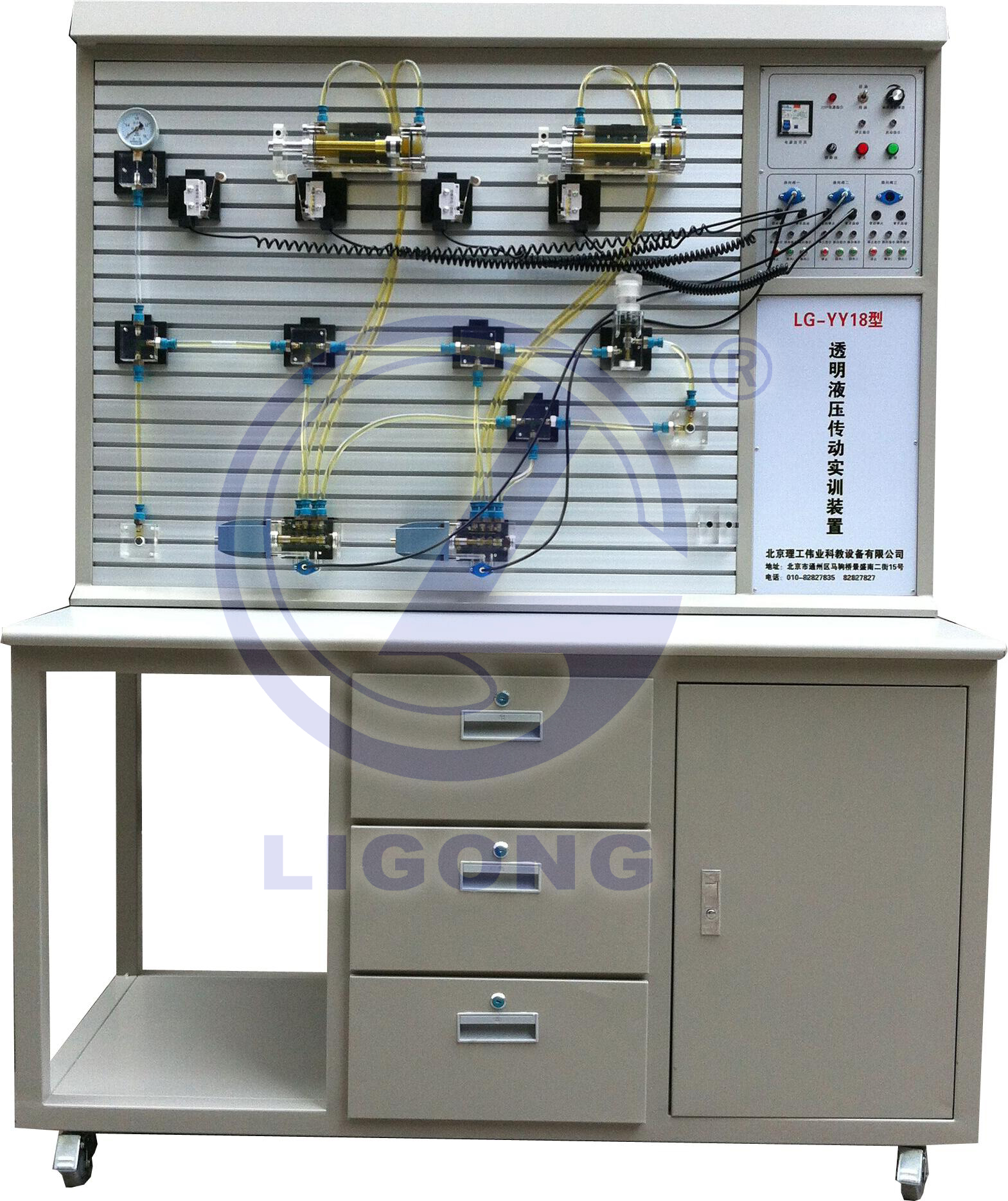 1、LG-YY18型 透明液壓傳動實訓裝置主要由實訓桌、實訓臺、液壓元件和電器控制器件。