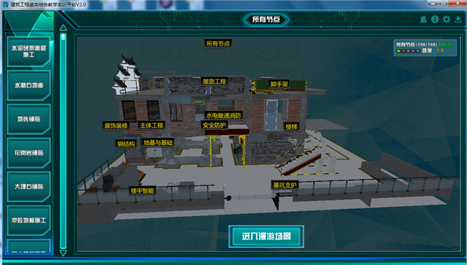 2. 建筑工程虛擬仿真教學(xué)軟件系統(tǒng)可通過(guò)漫游模式或點(diǎn)擊對(duì)應(yīng)菜單進(jìn)入仿真程序,并在進(jìn)入程序后可進(jìn)行相互切換。