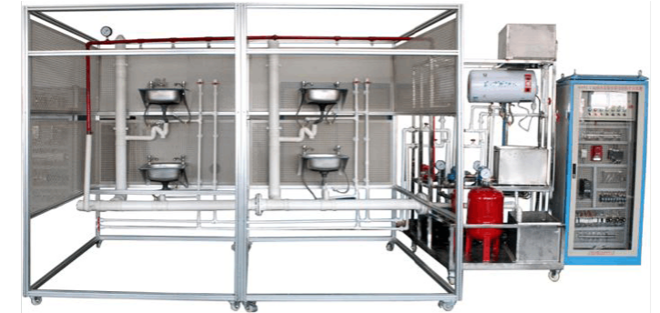 LG-LAPS02型 建筑給排水系統綜合實訓裝置是給排水對象模型整體采用鋁型材框架和網孔板進行設計,主要給排水管道設備安裝在鋼架底座上、具備開放式的特點,建筑給排水系統綜合實訓裝置由生活給水系統、消防給水系統、熱水給水系統、排水系統、污水處理系統和控制系統六個部分組成。