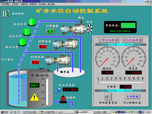 3. 具有完善的報警系統,能逼真的模擬工業現場的各種情況,如礦井液位、泵轉速及電機溫度的檢測信號故障報警,低水位、高水位以及超高水位的聲光同步報警、優先級報警,報警復位和報警禁止復位等功能