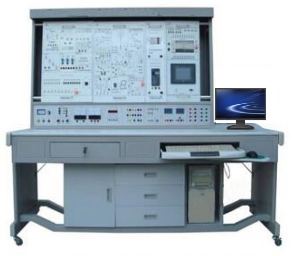 實訓裝置由控制屏、實訓桌、主機實訓組件、實訓模塊(含豐富的工業現場設備模擬實訓對象)、變頻器掛箱、觸摸屏掛箱、交直流電機、總線單元、通信模塊、電機導軌、測速機構等組成。