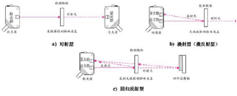 按照接收器接收光的方式的不同,光電式接近開關(guān)可分為對射式、反射式和漫射式3種,如圖2-16所示。