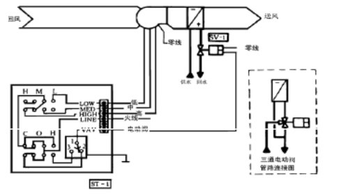圖2為兩管制冷熱盤管電子控制器加電動閥控制系統圖,圖中ST-1為風機盤管控制器,它包括了模式選擇開關、溫控器、風機轉速選擇開關三個部分。模式選擇開關可選擇冷(C)、熱(H)和關(O)三種狀態。制冷時若室溫高于設定值,溫控器觸點1和2接通,電動閥被打開,系統對室內提供冷氣。制熱時若室溫低于設定值,溫控器觸點1和3接通,電動閥被打開,系統對室內提供暖氣。溫控器的設定溫度在5℃~30℃范圍內可調。風機轉速選擇開關可手動選擇風機的高、中、低三檔轉速。SV-1為安裝在盤管回水管上的電動兩通閥,由溫控器控制,主要由它來控制盤管的冷熱量輸出。