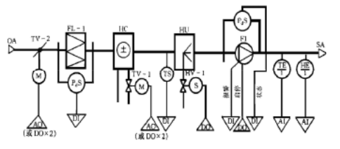新風機組采用集中控制,本方案采用DDC直接數字控制。新風機組DDC控制系統原理如圖3所示,為新風機組的直接數字控制(DDC)系統流程圖。其溫度控制系統由溫度傳感器TE、執行器電動兩通調節閥TV-1及換熱器和新風閥TV-2組成。濕度控制系統由濕度傳感器ME1、加濕電動兩通調節閥TVS、加濕器組成。過濾器報警及風機運行狀態和故障狀態監視系統由過濾器壓差開關PdS、防凍開關TS、風機過流繼電器常開觸頭(事故報警)、風機前后的壓差開關的常開觸點(狀態監視)及DDC輸出繼電器模塊組成。