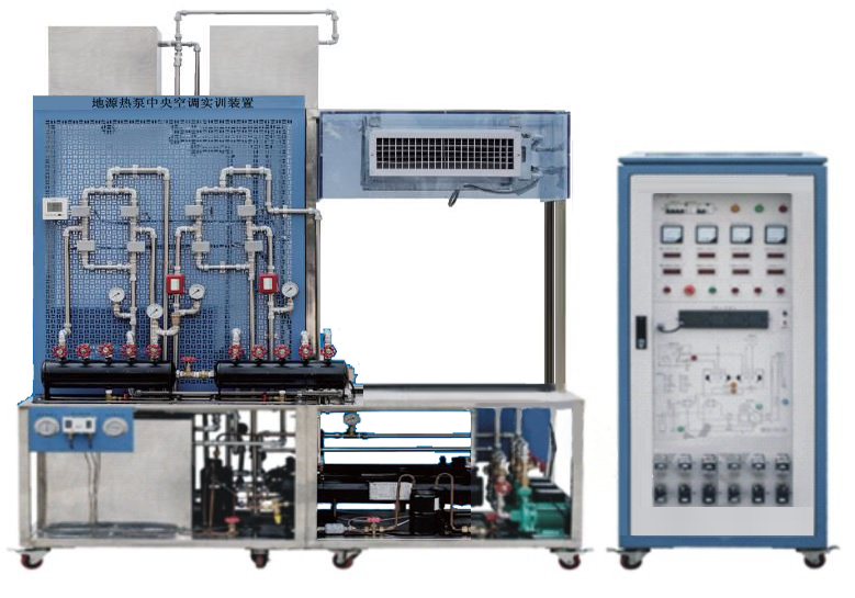 地源熱泵空調系統由制冷機組、模擬水井、空調系統、生活衛生供水系統、控制系統、實訓臺等組成。實訓臺采用不銹鋼底架結構,結構堅固,造型美觀大方;桌面用于安裝電源控制屏并提供一個寬敞舒適的工作臺面。