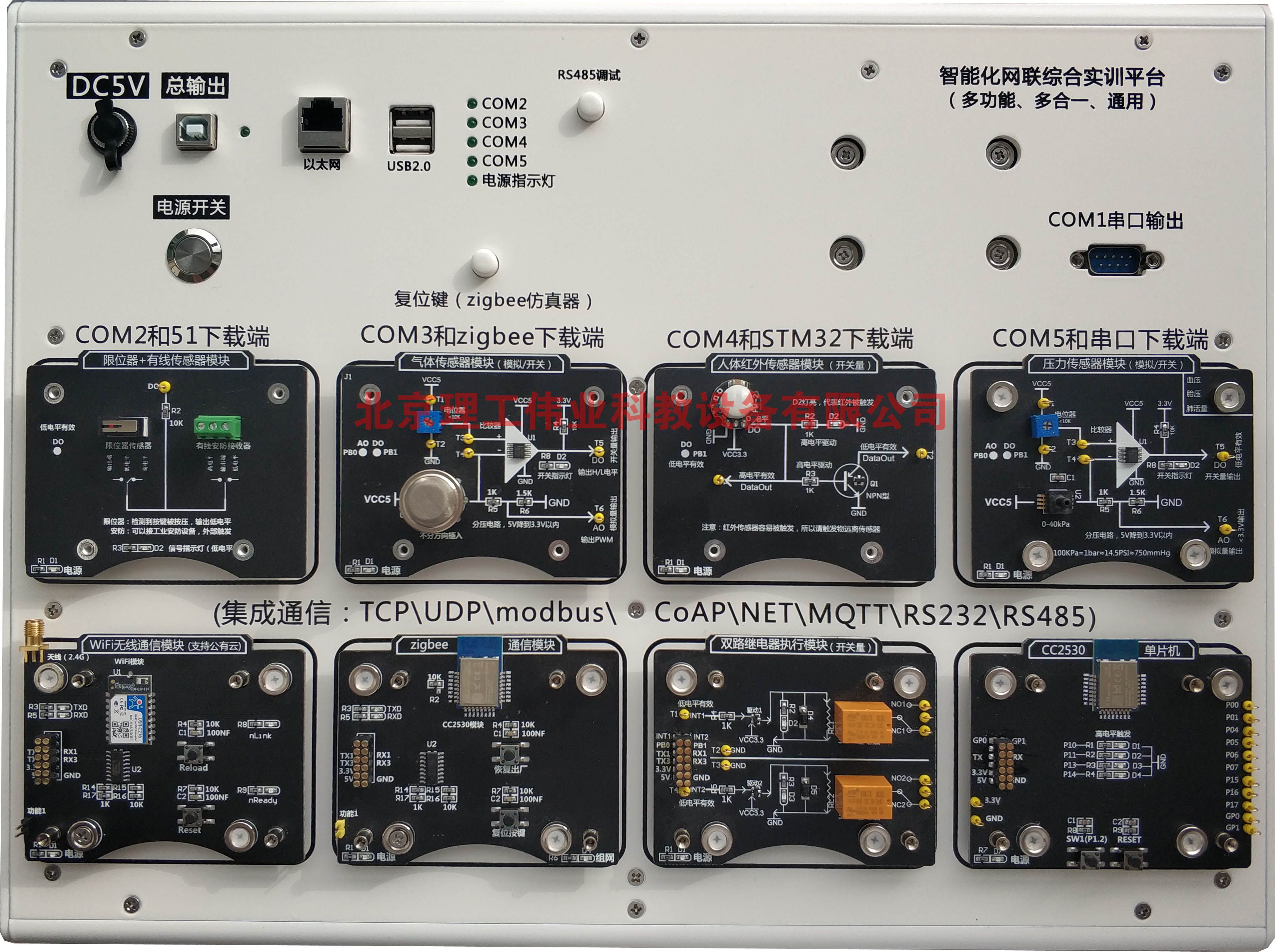 1.采用一體式供電結構,具備磁吸連接接口,提供5V供電接口、雙路USB接口、J-link下載接口、CC-debug下載接口、RS232/485串口接口,內置USB HUB, 通過 1 路 USB HUB,拓展8路USB 接口,實驗平臺具備8個通用實驗模塊插槽,集成防短路設計,提供了主板復位鍵以及ZigBee仿真器復位鍵,每個COM端對應一盞指示燈(藍色),COM1-COM4模塊正常工作時,指示燈閃爍,另外配有主板運行指示燈(藍色),實驗平臺正常運行時,指示燈常亮;