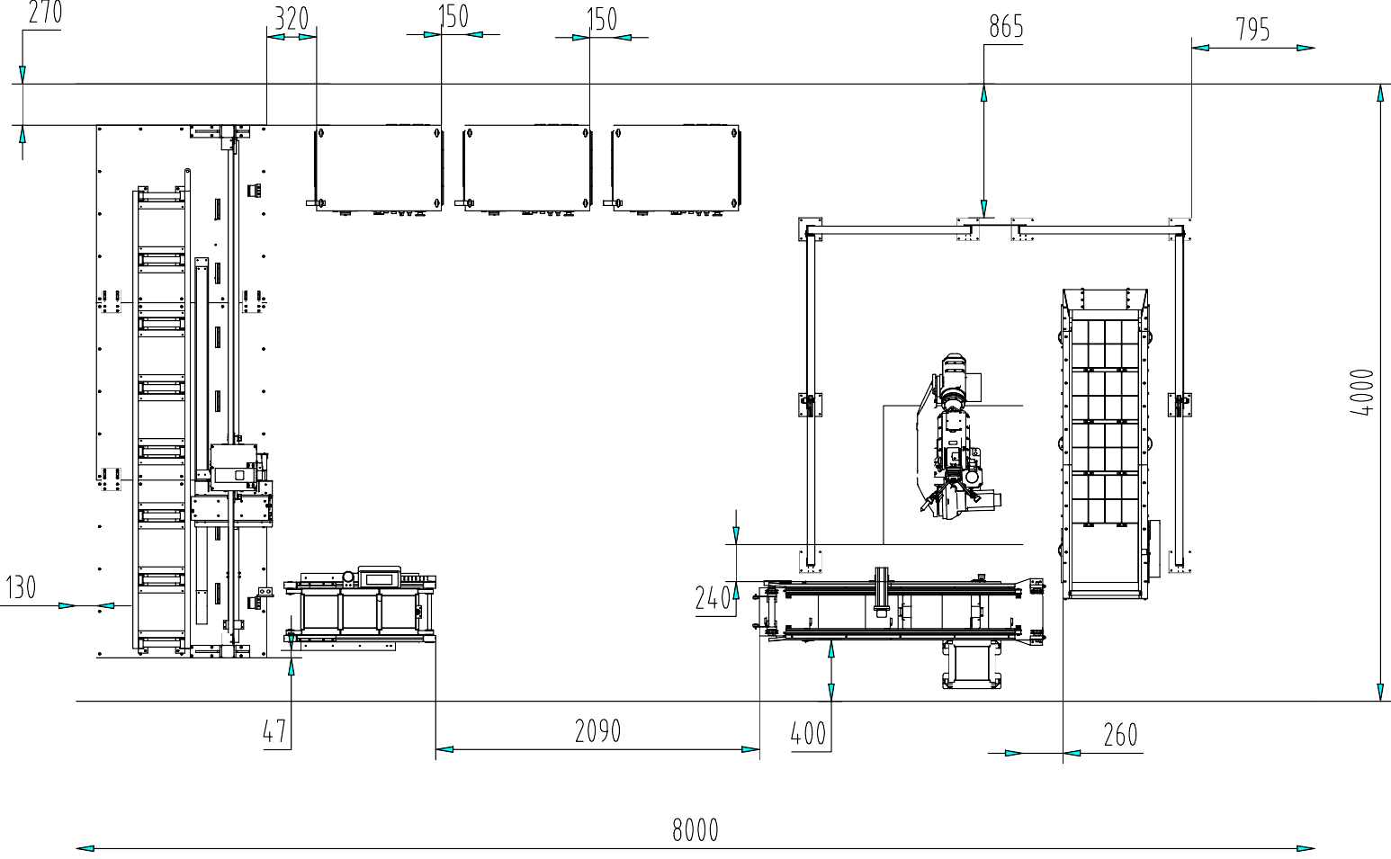 本設備共包括:工業(yè)機器人及控制柜、PLC 控制柜、托盤流水線、物品盒擺放流水線、AGV 小車等。比賽所用場地為 4m×8m,如圖 2-1 所示為裝備之間的大致布局,現場安裝時并不一定嚴格按照圖中所標尺寸安裝,允許有所變動。在安裝時需要注意以下事項: