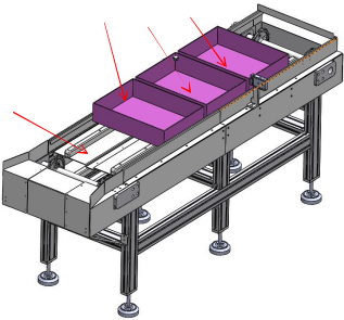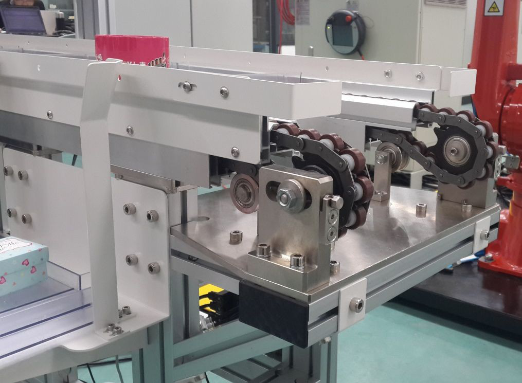 物品盒流水線采用板鏈結構,負責成品物品盒的裝箱及傳送,為5工位流水線,裝在3個物品盒(占用3個工位)。