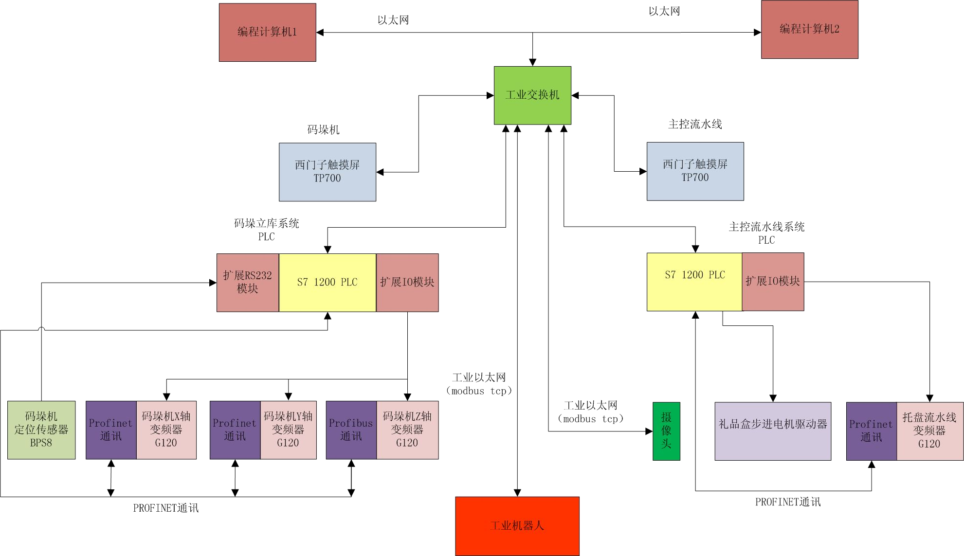 如上圖所示,整個系統(tǒng)通過工業(yè)以太網總線,把工業(yè)機器人、主控流水線 PLC、碼垛機立庫系統(tǒng) PLC、碼垛機立庫系統(tǒng)觸摸屏、主控流水線觸摸屏、視覺系統(tǒng)、變頻器以及編程開發(fā)計算機等均通過以太網連接。編程開發(fā)計算機負責開發(fā)調試程序、視覺系統(tǒng)特征識別開發(fā)以及機器人示教等編程。碼垛立庫系統(tǒng)和主控流水線觸摸屏負責管理碼垛立庫系統(tǒng)、主控流水線的運行參數,以及系統(tǒng)報警和提示信息等。- 上一篇:工業(yè)機器人與控制技術實訓裝置