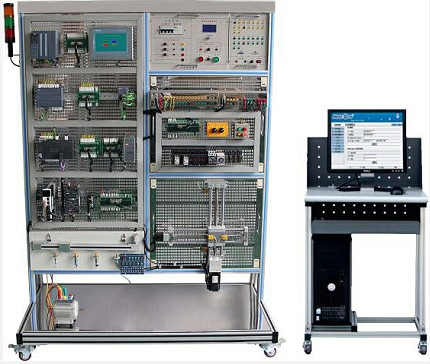 實訓裝置由S7-1500單元、S7-1200單元、變頻調速單元、伺服電機、實訓組件、電工基礎實訓單元二維絲桿控制單元、觸摸屏單元、以太網交換機、交流電機等組成。
