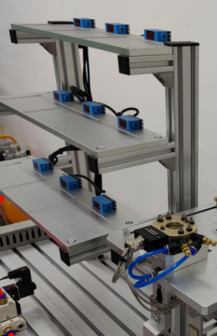 3、立體倉庫:存儲自動裝配工件;倉位數量:≥3列3層9個;倉位承重:≥2Kg;倉位尺寸:≥100mm×70mm×80mm;外形尺寸:≥350mm×180mm×450mm;工件種類:≥3種9個;工件模塊包括自動裝配母件、子件等。