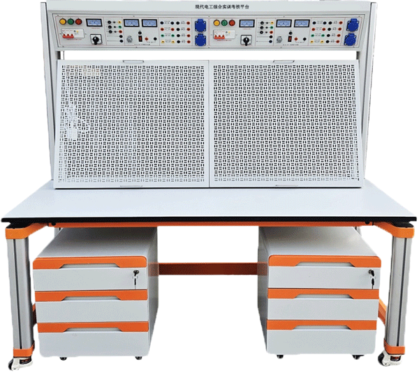 現代電工綜合實訓考核實訓臺由實訓屏(內置電源)、實訓桌、實訓儲物柜三大部分組成。