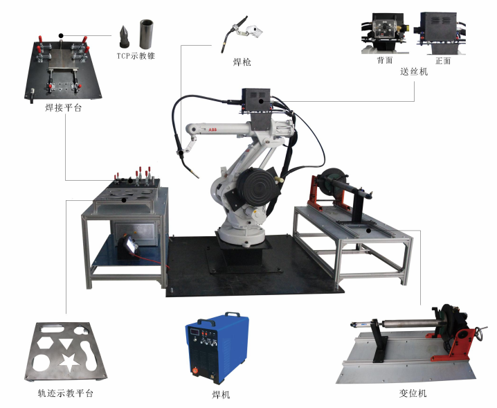 LG-BCHJ02型 工業焊接機器人實訓平臺涵蓋了工業機器人本體、機器人控制柜及示教器、機器人底座、機器人專用焊機及 送絲機、進口機器人焊槍、示教實驗臺、工裝卡具平臺、焊接專用變位機、電氣控制系統、氣 瓶、空壓機等硬件組成,經過多年的實際運用得到了國內普遍認可。