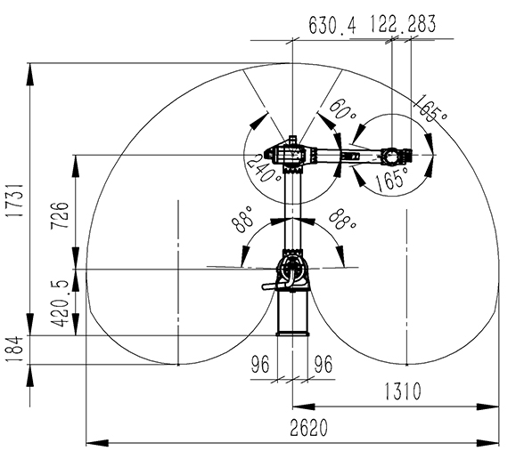 4、臂長更大、負載能力更強:通過輕量化的設計,使用高速電機、高精度的減速器,使機器人臂長增加至1310mm,*大負載10kg。