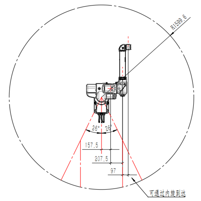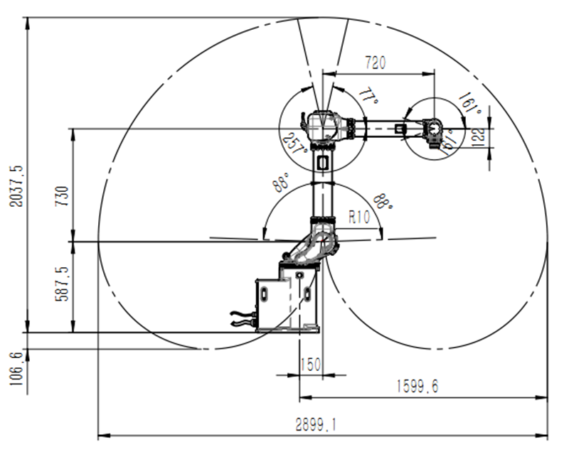 4、臂長更大、負載能力更強:通過輕量化的設計,使用高速電機、高精度的減速器,使機器人臂長增加至1599.6mm,額定負載16kg,可偏心80mm。