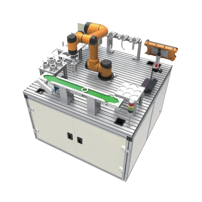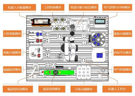工作臺整體由兩個基礎臺拼接而成,更具空間靈活,拆卸方便等特點。臺面采用標準鋁型材,機器人 及功能模塊可根據(jù)需求改變布局位置,所有功能模塊采用手擰螺栓方式固定,可實現(xiàn)無工具快速拆裝與更 換。每個模塊電氣部分配置了獨立的電氣接線盒和快速航插,可實現(xiàn)模塊整體機械和電氣快速安裝部署, 還可根據(jù)需求更換或添加功能模塊進行功能擴展。
