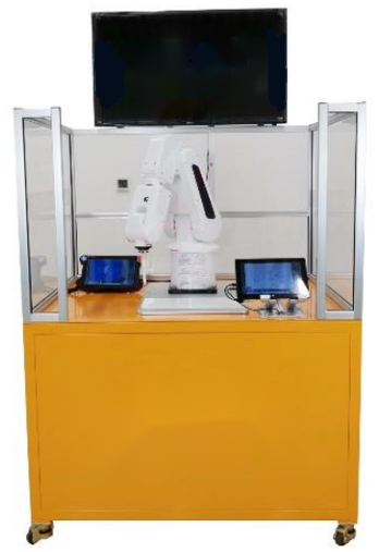 該設備采用一體化的形式,外觀簡潔大氣,結構牢固。設備下半部分使用鈑金桌體,噴漆顏色為工業黃,上半部分在鋁型材框架中裝有有機玻璃,確保設備周圍人員的安全,在框架上配備有一臺顯示器,可在屏幕上展示設備圖片或者運行視屏等內容。在該設備上搭載有HRT-120寫字繪畫模塊和恒銳HRP-M多系統編程移動平臺,機器人可將該平板繪畫板上書畫的字和圖案按原畫在畫布上重現。