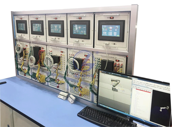 (4)配置與真實(shí)產(chǎn)線一致的PLC、人機(jī)界面,各6個(gè)站;西門子1200系列PLC6臺(tái);昆侖通態(tài)TCP7032KT觸摸屏6臺(tái);機(jī)器人示教器1套所有端口引出至面板的安全插座上,方便實(shí)驗(yàn)連線。每個(gè)模塊安裝在掛箱上。