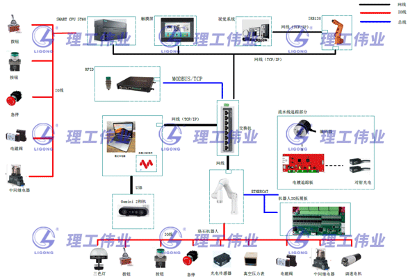 此款設備既可滿足學校針對機器人教學功能的要求,也可完成機器視覺的功能教學。設備體現了智能控制的基本概念,為后續要推廣的智能控制及智能制造兩大領域有很好的理解和影響力。下圖展示了各單元組成。