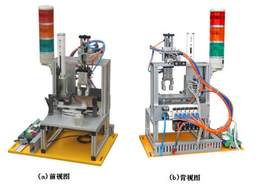 主要由井式供料單元、三工位旋轉工作臺、平面軸承、沖壓裝配單元、光電傳感器、電感傳感器、磁性開關、電磁閥、步進電機及驅動器、支架、機械零部件構成。工作過程描述:該站主要完成大小工件的緊合裝配過程。當搬運站氣動機械手把工件運送到裝配站旋轉工作臺上后,旋轉工作臺順時針旋轉,將工件旋轉到井式供料單元下方,井式供料單元頂料氣缸伸出頂住倒數第二個工件;擋料氣缸縮回,工件庫中底層的工件落到待裝配工件上,擋料氣缸伸出到位,頂料氣缸縮回物料落到工件庫底層,同時旋轉工作臺順時針旋轉,將工件旋轉到沖壓裝配單元下方,沖壓氣缸下壓,完成工件緊合裝配后,氣缸回到原位,旋轉工作臺順時針旋轉到待搬運位置后,搬運站氣動機械手伸出并抓取該工件,并將其運送往物料分揀站。