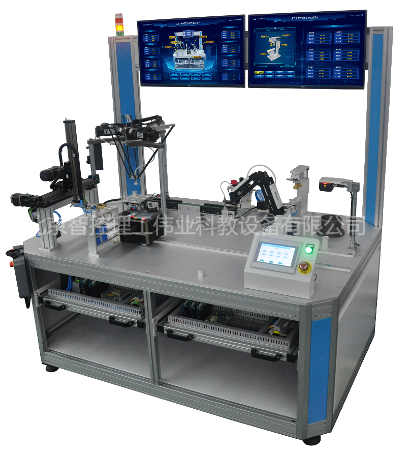裝置是一套可以模擬一個智能化車間生產運行的綜合性應用系統,整個裝置可以實現從立體倉庫管理、智能小車輸送、機器人搬運、模擬加工、視覺檢測、數字化信息采集、可視化數據監控、工業互聯網應用開發,實驗裝置流程可實現由并聯機器人取料-傳輸-多軸機械手搬運-加工-檢測-智能車運輸-立體倉庫存的正向流程,配套的數字孿生系統可以實現與實物機構的實時同步運動,系統由分布式組合控制方式可以開展單機應用實訓,也可以開展組合控制實訓。