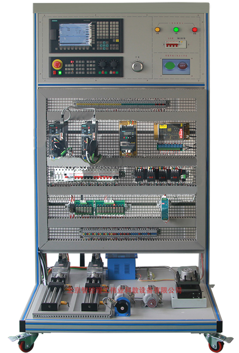 (1)電氣控制平臺采用鋁合金型材、網孔板開放式設計,立式結構,符合真實的數控電氣安裝環境,主要由數控系統、進給驅動、主軸單元、PMC單元、刀架控制電路、冷卻控制電路、接口單元、保護電路、電源電路等組成。該單元包含完整的數控車床電氣控制部分,以及接口轉換單元。