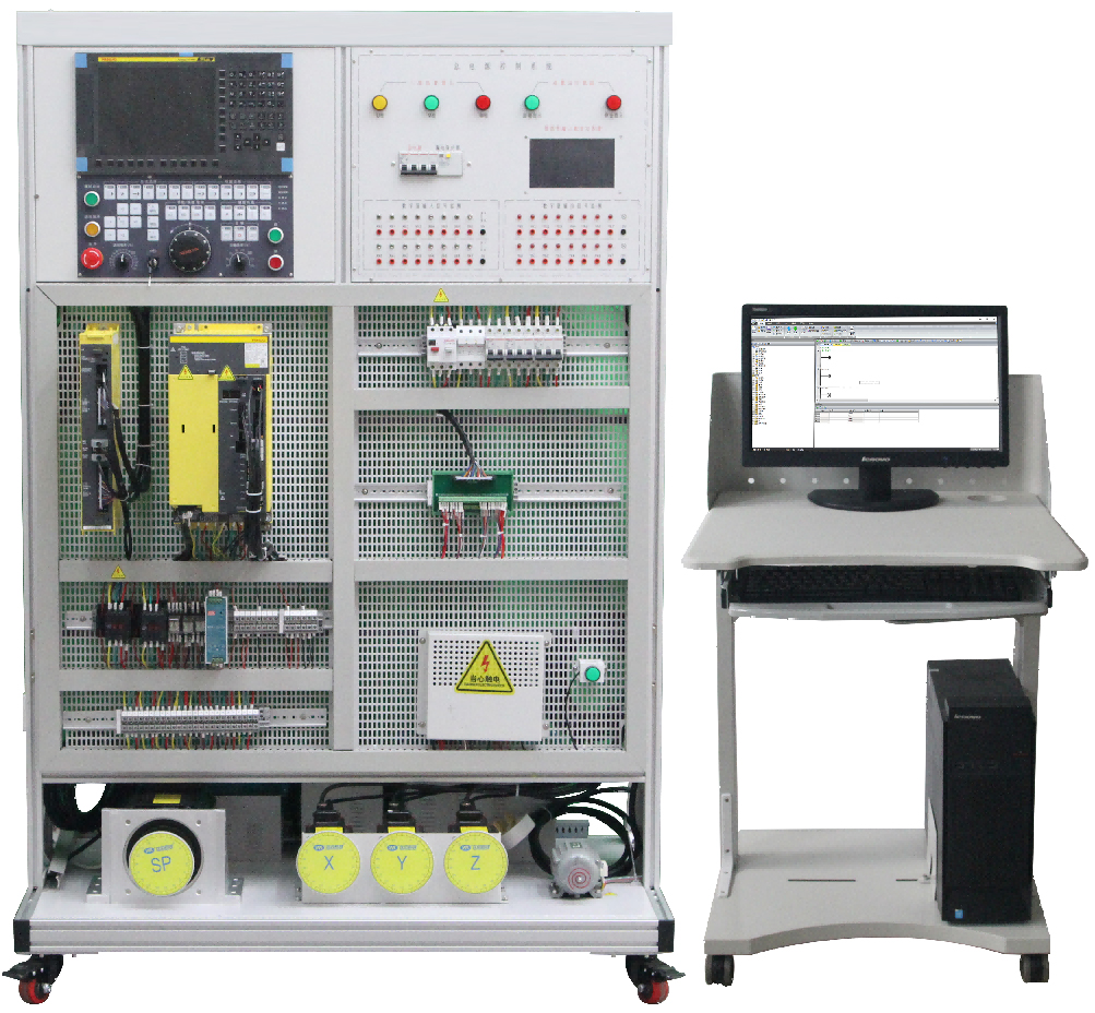 1.電氣控制平臺采用鋁合金型材、網孔板開放式設計,立式結構,符合真實的數控電氣安裝環境,主要由數控系統、進給驅動、主軸單元、PMC單元、冷卻控制電路、接口單元、保護電路、電源電路等組成。該單元包含完整的數控銑床電氣控制部分,以及接口轉換單元。