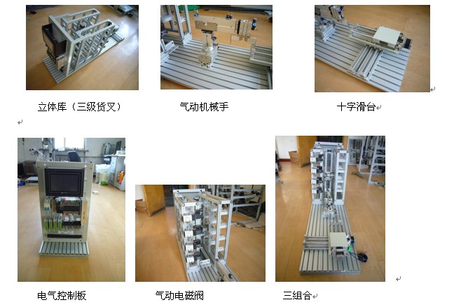 LGZH-02 柔性三組合機電一體化創(chuàng)新模型實現(xiàn)動作為:首先立體庫堆垛機具有水平垂直運動,由步進電機拖動,帶動貨叉,進行貨物存取,貨叉為三級機械傳動。氣動機械手可實現(xiàn)手爪抓取,提升,轉半圈,放下,松開手爪。十字滑臺可走出四角上一周的四個位置,上方裝有筆架,可以繪圖寫字,上方還裝有接近開關和顏色開關及支架,可對滑臺上的物體進行識別。