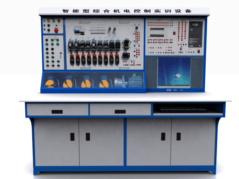 3、實訓屏部分:實訓屏與電腦桌采用整體式結構,計算機顯示器采用嵌入式設計,整機美觀大方。實訓屏分上下兩部分,上部分為掛箱(模塊)空位,以及PLC,公用按鍵指示燈板,漏電開關等;下部分是通用電機控制區,所有電機均能通過透明有機玻璃窗觀測到,并且控制端都以插線端子的形式引出,方便學員實訓。