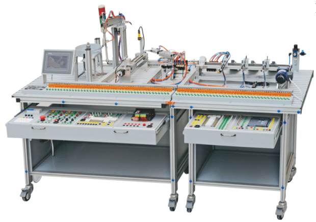 在鋁合金導軌式實訓臺上安裝模擬下料、模擬加工、模擬裝配、模擬搬運、模擬分揀等工作站,構成一個典型的機電一體化設備的機械平臺;包括三菱PLC(控制點數需滿足要求)、氣動系統、步進控制系統、旋轉編碼器反饋系統、三菱變頻器、三菱觸摸屏、模擬量模塊(配檢測傳感器)、通信模塊、采用RS485串行通訊方式實現分布式的控制,網絡中必須有一臺PLC為主站,其他PLC為從站。從而組成自動加工、裝配生產線,真實呈現自動生產線的加工過程。