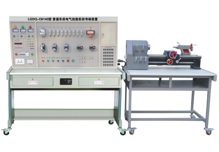 LGDQ-C6140型 普通車床電氣技能實訓考核裝置(半實物)由電源控制部分、機床電氣控制部分、半仿真機床實物部分構成。電源控制部分包括實訓定時、定時報警、安全用電自動控制等,機床電氣控制部分把整臺機床內部電器裝在正面面板上,能直觀地觀察機床工作時各電器的動作狀況。故障點在面板上設有相應測試點,供實訓考核者測試用。仿真機床部分能模擬機床各種運動。通過LGDQ-C6140型 普通車床電氣技能實訓考核裝置的實訓能使學員掌握機床常見故障的現(xiàn)象、故障產生的大概部位,熟練掌握機床電路工作原理,其是維修電工初、中、高級技能鑒定的理想設備。