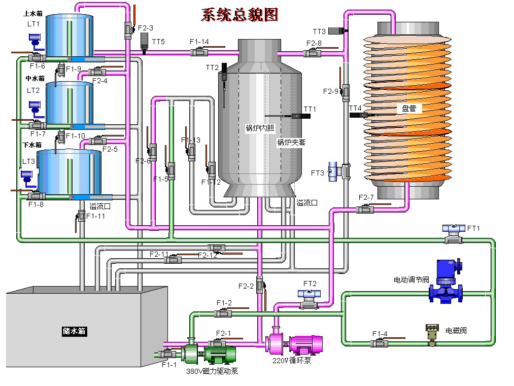 實(shí)驗(yàn)對(duì)象系統(tǒng)包含有:不銹鋼儲(chǔ)水箱;上、中、下三個(gè)串接有機(jī)玻璃圓筒型水箱;三相4.5kW電加熱鍋爐(由不銹鋼鍋爐內(nèi)膽加溫筒和封閉式外循環(huán)不銹鋼冷卻鍋爐夾套構(gòu)成)和鋁塑盤管組成。