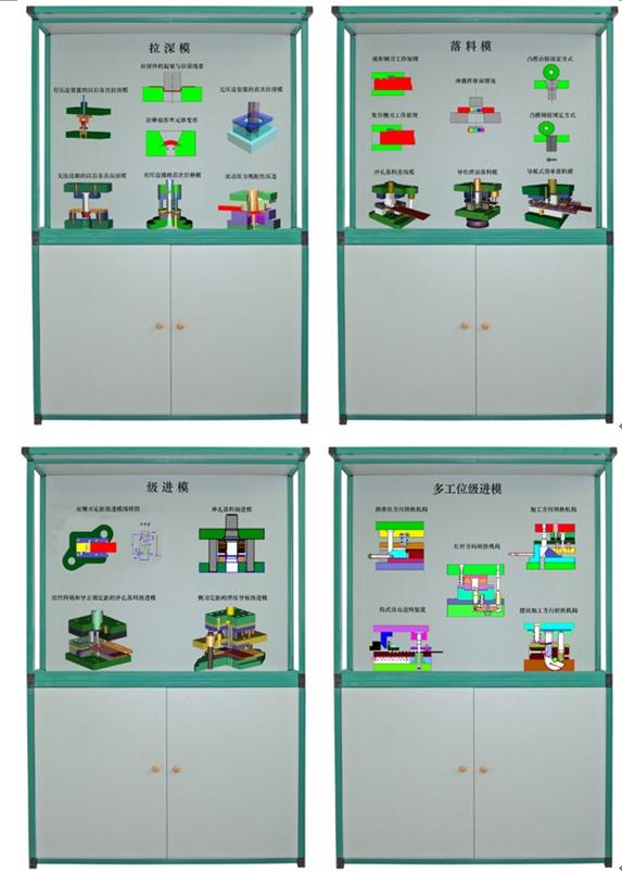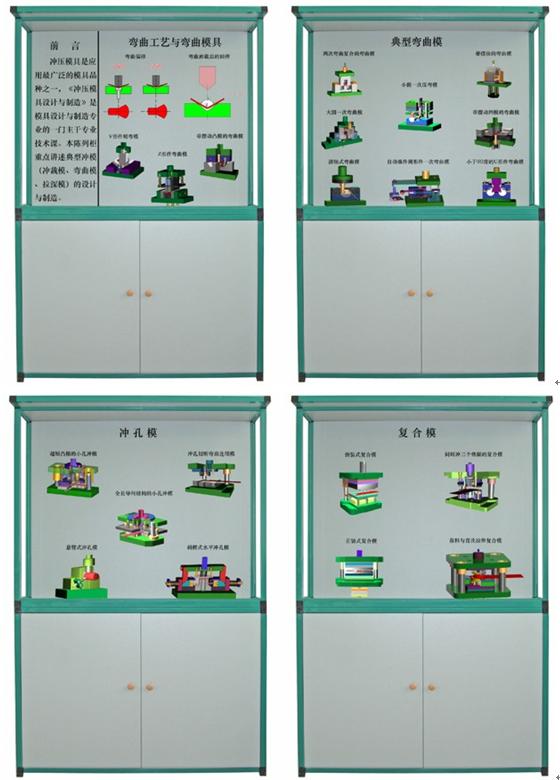 CLG-N04型 多媒體智能控制《沖壓模具設計與制造》陳列柜是模具設計與制造專業的一門主干專業技術課。適用于《沖壓模具設計與制造》、《沖模設計應用實例》等課程。本課程是以教育部高教司《關于加強高職高專人才培養工作的若干意見》等文件對高職高專人才培養的要求為指導思想。采用多種素材和媒體手段,講述典型沖模(沖裁模、彎曲模、拉深模)的設計與制造,適度介紹了多工位級進模設計與制造。陳列柜共分八個柜和一個電腦控制臺,進行多媒體聲控同步解說演示。柜內47件模型均采用動畫圖像由PC電腦軟件控制順序或任選播放演示沖壓模具功能原理。