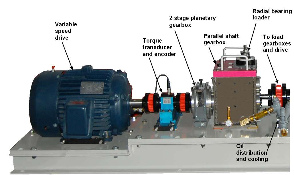 - 兩個并??列的平行軸齒輪箱與更大的負載容量比試驗變速箱;一個齒輪箱具有兩個階段的增速器,一個變速箱有三個階段增速