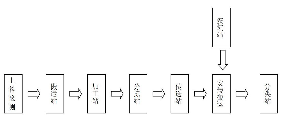 下圖給出了系統中工件從一站到另一站的物流傳遞過程:上料檢測單元將大工件按順序排好后提升送出;搬運站將大工件從上料檢測單元搬至加工站;加工站將大工件加工后送出工位;分揀站將加工過的正常的工件搬運到傳送站,如果是廢料,分揀機械手將工件搬運到廢料處理機構;傳輸站將正常的大工件送至尾端,將廢料分揀到廢料槽里;安裝搬運站將大工件從傳輸站搬至安裝工位放下。安裝站再將對應的小工件裝入大工件中。而后,安裝搬運站再將安裝好的工件送分類站,分類站再將工件送入相應的料倉。