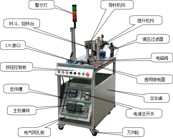 由料斗、回轉臺、導料機構、平面推力軸承、工件滑道、提升裝置、檢測工件和顏色識別光電開關、開關電源、可編程序控制器、按鈕、I/O接口板、通訊接口板、電氣網孔板、直流減速電機、電磁閥及氣缸組成,主要完成將工件從回傳上料臺依次送到檢測工位,提升裝置將工件提升并檢測工件顏色。