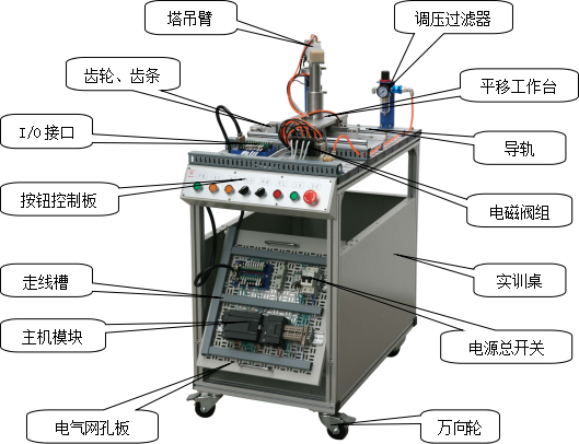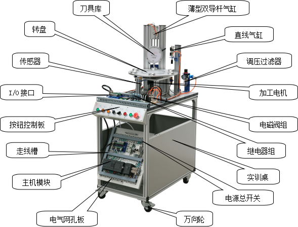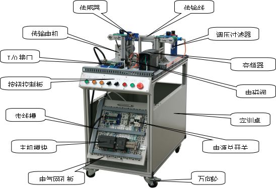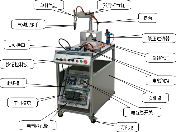 該系統上使用了大量的氣動元件,包括多種電控氣動閥、多種氣動缸、氣動夾爪、真空吸盤、真空發生器、過濾減速閥等。在學習這些氣動元件時,不但可以單獨學習每一種分離元件,而且還可以在學習時了解各種氣動元件之間,以及氣動元件與其它元件之間,如何配合起來并協調進行工作的。
