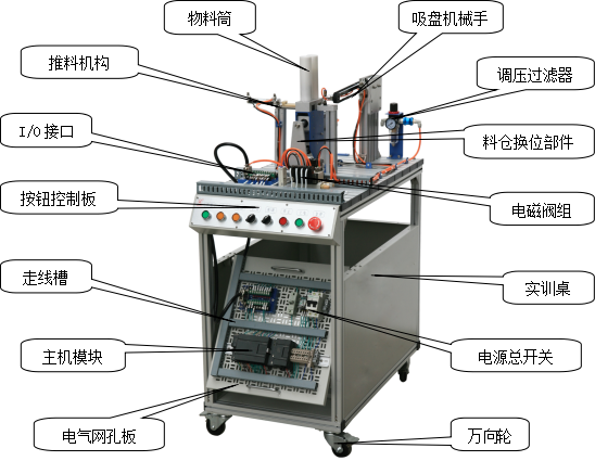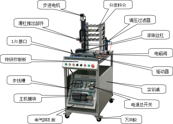 由滾珠絲杠、滑桿推出部件、分類料倉、步進電機、步進驅動器、電感傳感器、開關電源、可編程序控制器、按鈕、I/O接口板、通訊接口板、電氣網孔板、多種類型電磁閥及氣缸組成,主要完成按工件類型分類,將工件推入料倉。