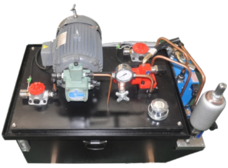 液壓泵站由三相電機(jī)、變量葉片泵、單向閥、 風(fēng)冷器、空氣濾清器、油溫油面計(jì)、精密過濾器、壓力表、蓄能器、泄壓閥組等組成。