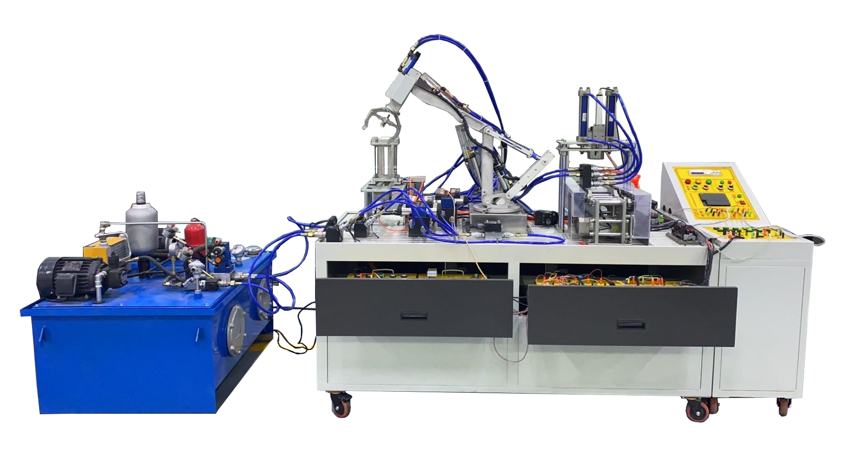 機電液一體化智能綜合實訓平臺主要由實訓平臺、五級液壓機械手、液壓元件模塊、液壓閥實訓模塊、氣動元件模塊、電氣控制模塊、測控儀表、裝調工具、實訓配件等組成。
